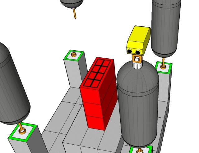 Submarines are yellow, hook-ups are orange, red is the relief hatch chimney, the docking platforms are green with white. The purpose of the coloring is to identify objects in the murky deep.