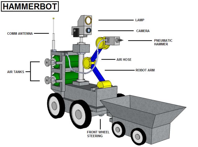 This one I call ‘Hammerbot.’ It uses a pneumatic-powered hammer to chisel into rock. Originally, I had the idea that the broken rock would then fall into the wagon that the robot is pushing in front. Then I realized that there are many reasons why that won’t work, most of all because the poor little robot’s arm isn’t long enough to reach over the wagon.