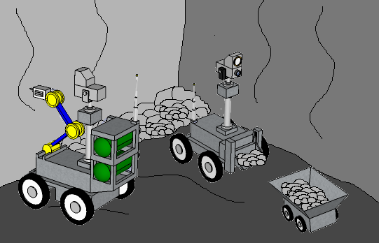 Isn’t it adorable? On the left, you have hammerbot creating a pile of ore chippings at the base of the cave wall. Then on the right is shovelbot, carrying the ore chippings to a wagon. Observant viewers will notice that the scene has been horizontally flipped because I collaged the picture the other way, then realized I wanted it to read the activity left to right.