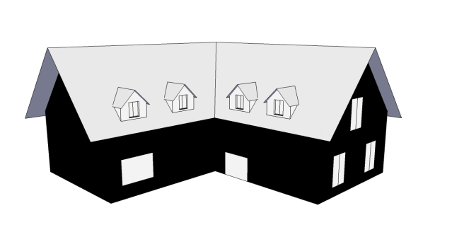 The gables and roof are components, which really does make it a lot easier to draw things. I was wondering how the gables would turn out when they intersected the roof, but that’s what Intersect with Model is for. So I learned how to do that. Unfortunately, I learned how to do that before I made a roof component with overhangs, so I had to redo Intersect with Model. Or rather, I redid it for the far right gable, then I thought, “What the heck, it’s not professional work.” So I didn’t redo IwM for the other gables, and you can tell if you look closely at how their roofs intersect with the house roof. Which actually is kind of instructive. One of those cases where being lazy and incomplete is actually the right thing to do. Like not rewriting the previous sentence to be less grammatically ambiguous.