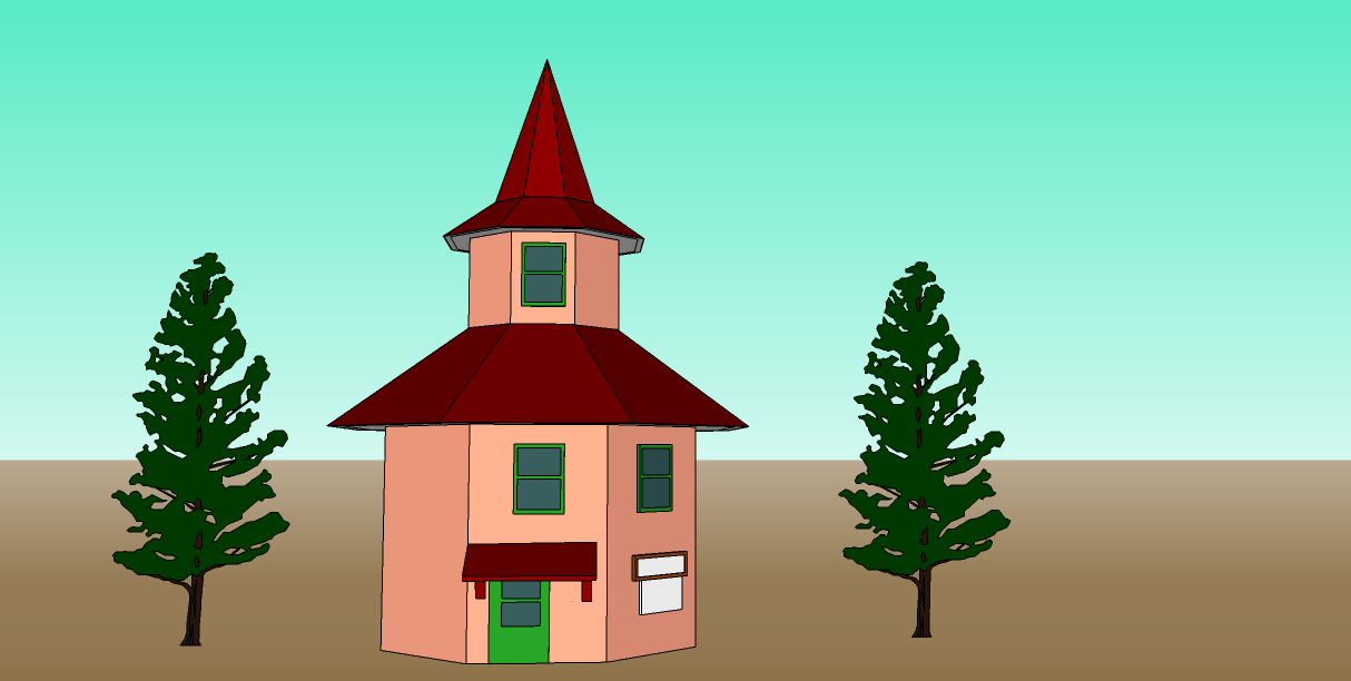Then I went to Warehouse and searched for it, and didn’t find it. I couldn’t believe that omission, so I tried to make my own octogonal monkey house. It didn’t get very far, because after making the base, I tried to make the upper part by shrinking a copy of the base and loading it on top. But I forgot to make the base a component, so the top got stuck to the bottom like so: