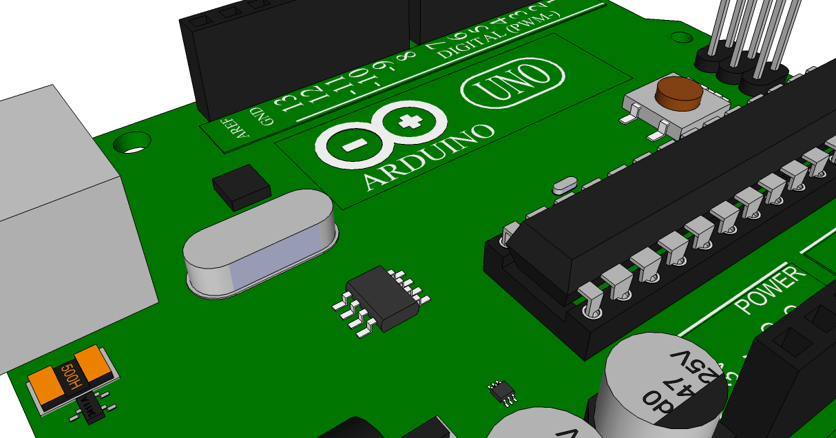 Based on the Arduino Duemilanova models I found in Google 3D Warehouse. It seems that one Arduino model is based upon another in the Warehouse in an evolutionary growth, so it’s hard to give credit for the original design. Suffice to say, I’ve had to revise and add stuff, but I didn’t start from scratch.