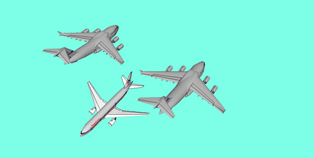 Sketchup also has a feature to very easily render shadows and shading accurately for the time and geographical location. But without knowing the exact flight headings and trajectories, I really couldn’t represent how it actually looked. On the other hand, while playing with the model some more I did put in shadows for arbitrary time-location settings, and it so happened that the shadow of a C-17 fell across the fuselage of the 777. Very dramatic!