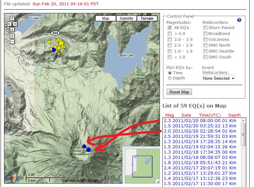 Well, in the past twenty-four hours, there have been two quakes of magnitude 2.0 or greater which have occured directly beneath the dormant volcano’s caldera. This is shown at the Pacific Northwest Seismic Network page:
