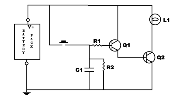On Saturday, I reported that I didn’t have enough current gain in my autofade lamp test circuit to get a flashlight lamp to glow. The solution was to insert a second transistor, so that the circuit looks like this now: