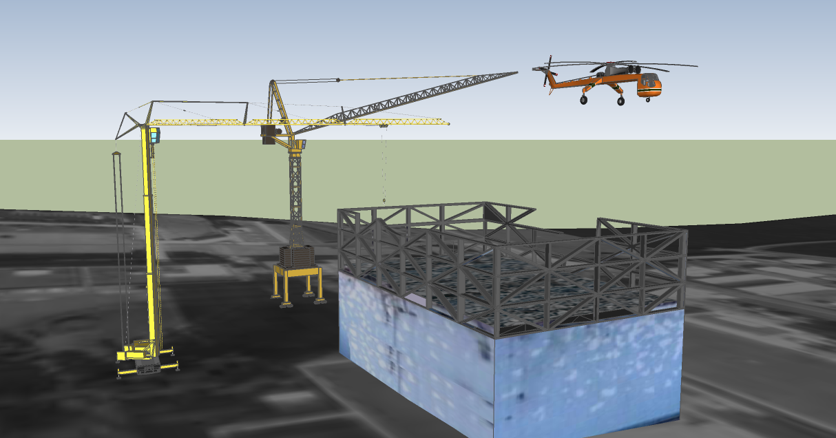 Another way, as shown in the above sketchup image, would be to use tower cranes to position water hoses into the damaged pool. I show both stationary and mobile tower cranes. If Google Sketchup Warehouse has the proper dimensions for the equipment and buildings, this technique appears workable.