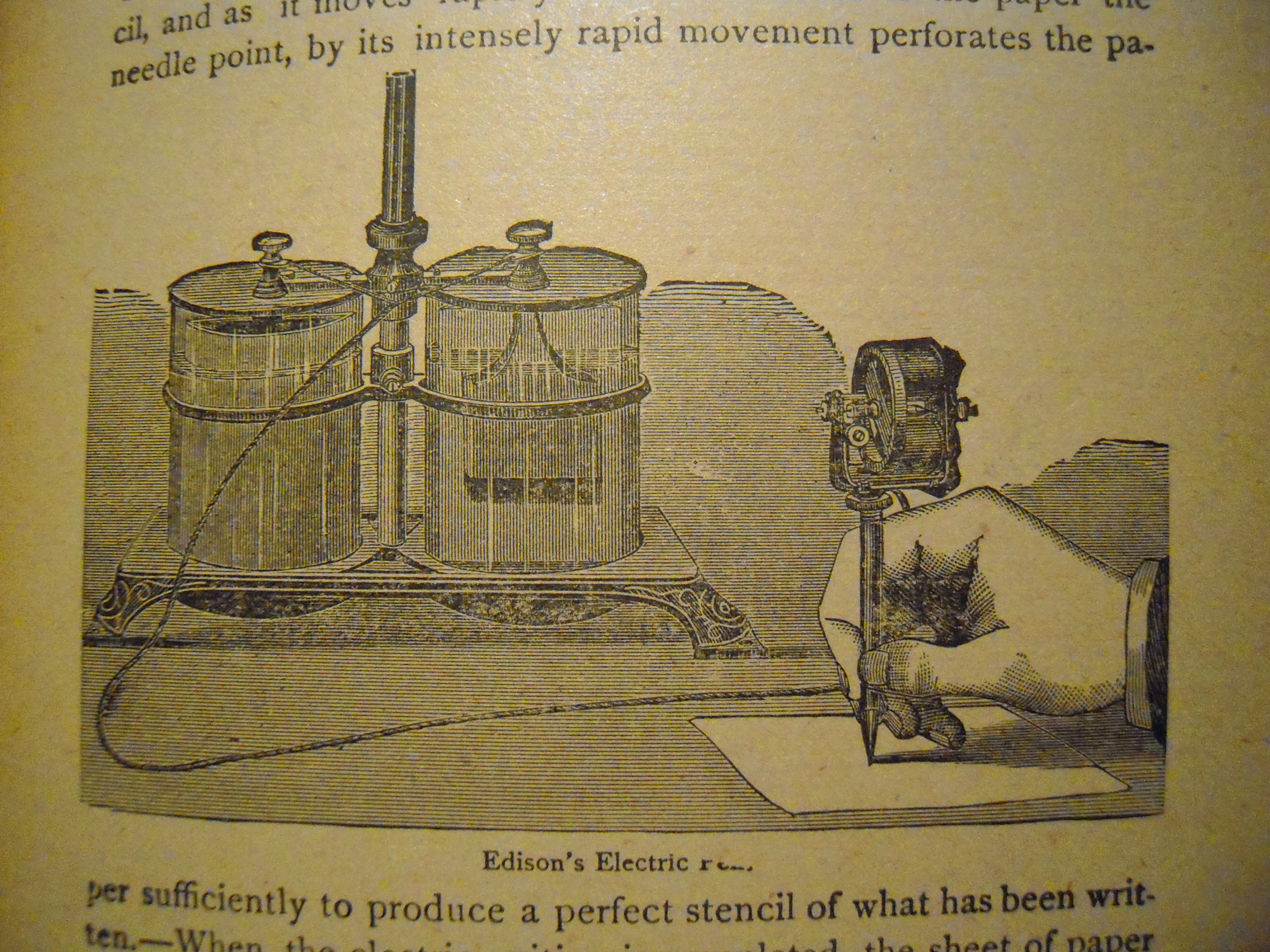 Well, he is credited with inventing the electric light, but as we all know by now, he was more an innovator in that. Still, the book recounts an impressive list: the New Edison Dynamo, the Pyro-Magnetic Dynamo, Train Telegraph, the Mimeograph, Etheric Force (“a new discovery”), Tasimeter, Harmonic Engine, Multiplying Copying Ink, and of course, The Sonorous Voltameter.