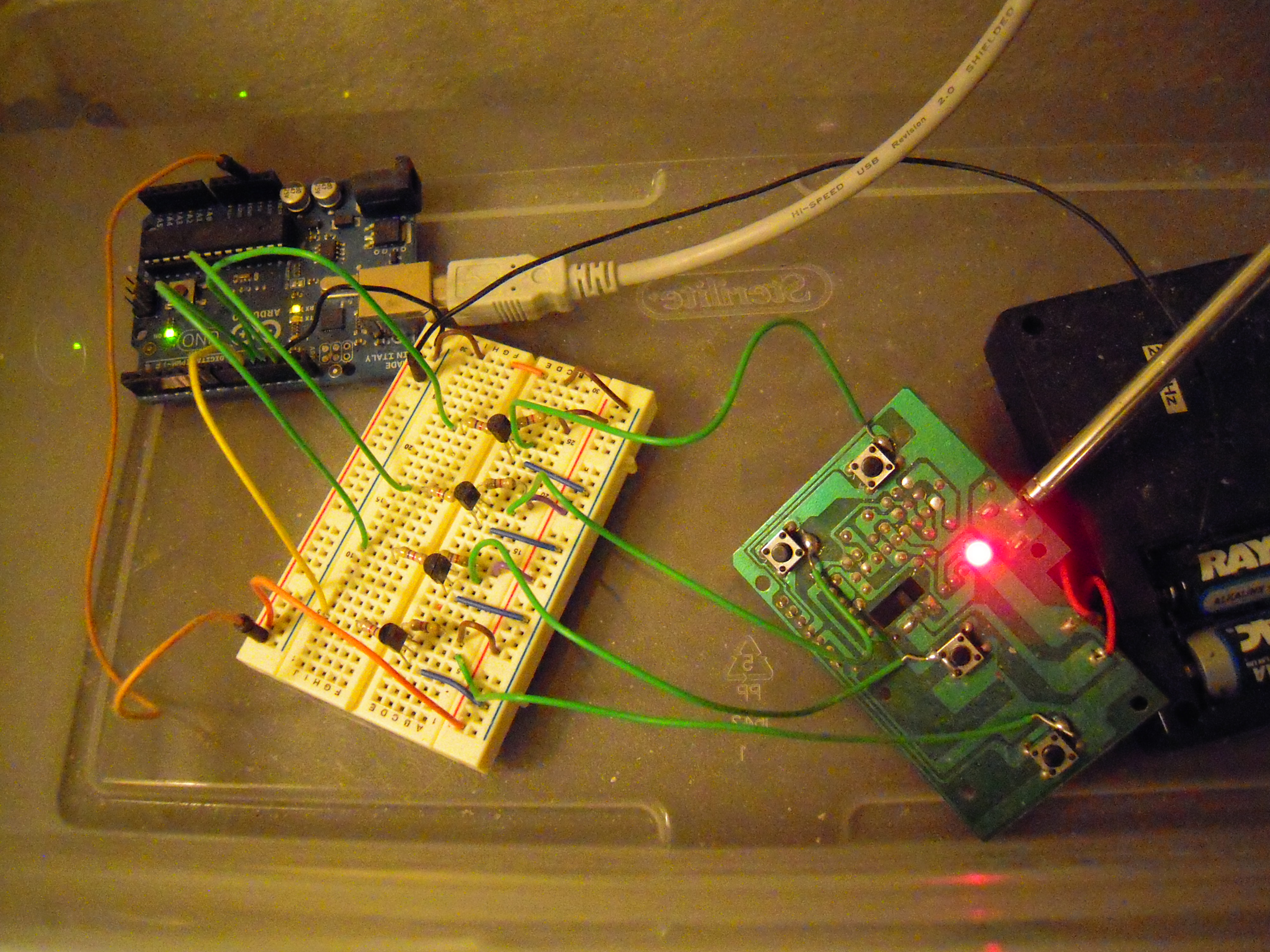 Here’s the hardware interface with the USB cable going to the computer and the actual RC keypad ‘hacked’ by simply soldering connections next to the control buttons:
