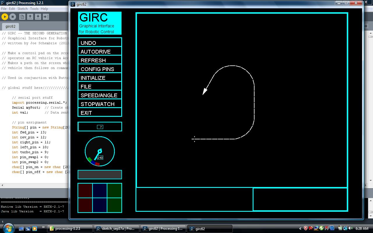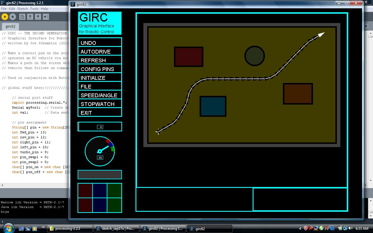 GIRC is my program to operate a remote-control vehicle via computer with a graphical user interface. The program is written in Processing and an Arduino is used for the hardware interface.