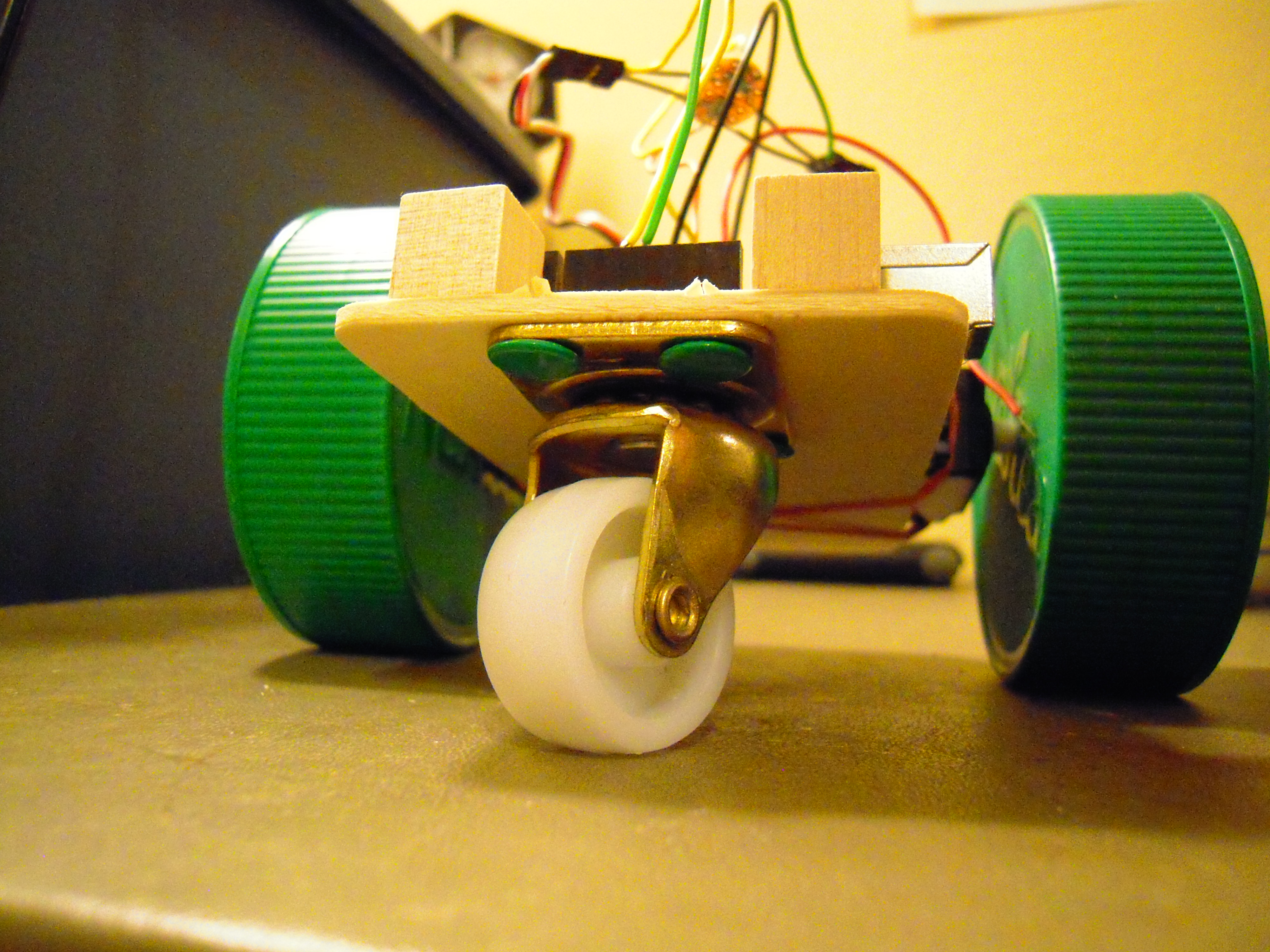 The new wheels are much wider and have grooves, so that traction is good enough to run on the carpet now. I used pieces of cork to secure the screws to the wheels. I don’t know if that helps, but it seemed like the right thing to do.