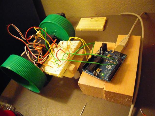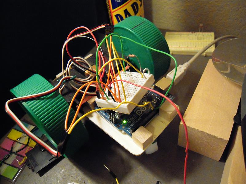 Note there wasn’t enough room to comfortably fit the breadboard and the arduino together on the robot chassis. But now . . .