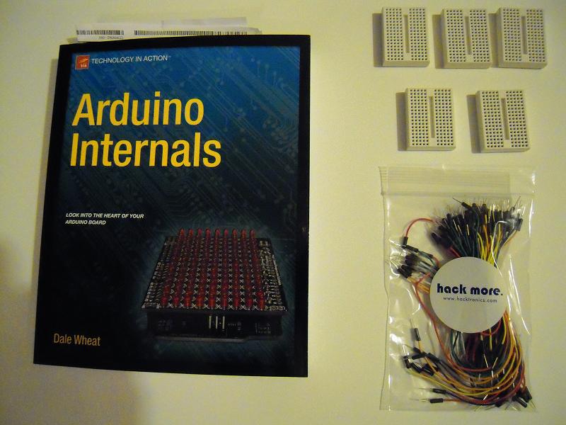 The mini breadboards come from Sparkfun for just $3.95 and conveniently are just the right size to fit between the headers of the Arduino. The Hacktronics flexible jumper wires cost about $10 what with shipping and handling added onto the price for a set of 100.