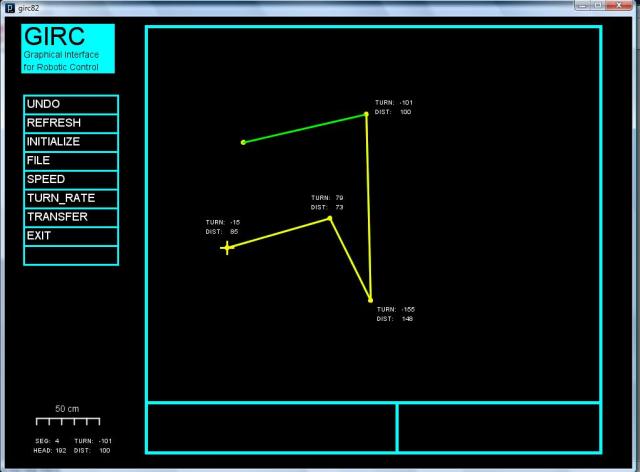 The user inputs path data to GIRC by clicking points on the screen. Processing then draws segments between the points and calculates x,y coordinate data. This data is then converted into distance and turn data which will then be sent to the arduino aboard the robot.