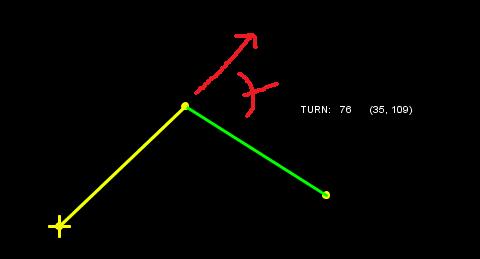 Here we make a 76 degree right turn in GIRC, and this information has to be sent over the USB/Serial cable to the microcontroller aboard the robot. This communication is done with a control code pair. As shown, the first control code specifies that the turn is to the right and less than 90 degrees. The second control code gives the amount of turn in degrees plus 33.