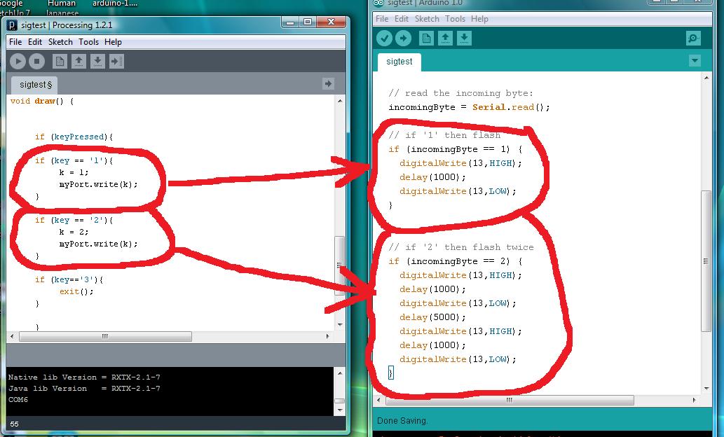 The sketch on the left is written in Processing and writes to the serial port. The sketch on the right is written in Wiring (that is, Arduino-ese) and reads from the serial port.