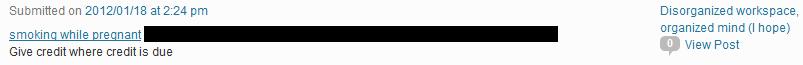 Okay, this one I am going to block out the link, but please note, this is from a website purporting to be about ‘smoking while pregnant’ and is all but accusing me of plagiarism for photographing my own cluttered work table in my own cluttered apartment: