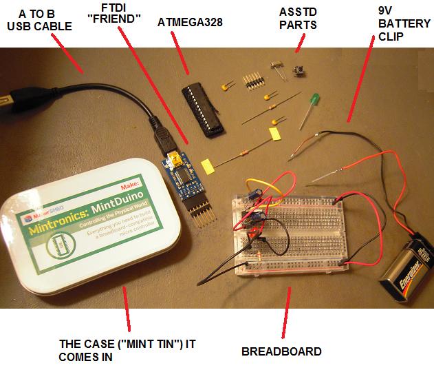 The FTDI “Friend” is needed to program the Mintduino from your computer and does not come with the Mintduino package. The A to B USB cable doesn’t come with the Mintduino or the FTDI “Friend” but fortunately I had one laying around. Possibly you do too, they’re quite common.