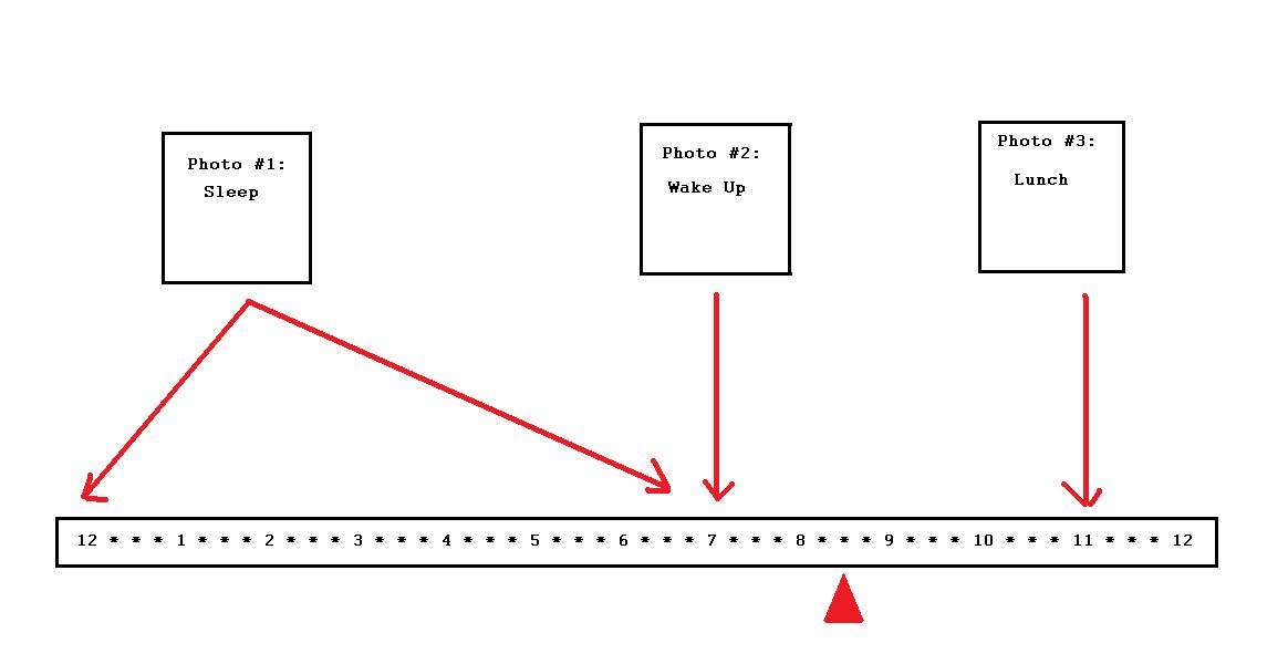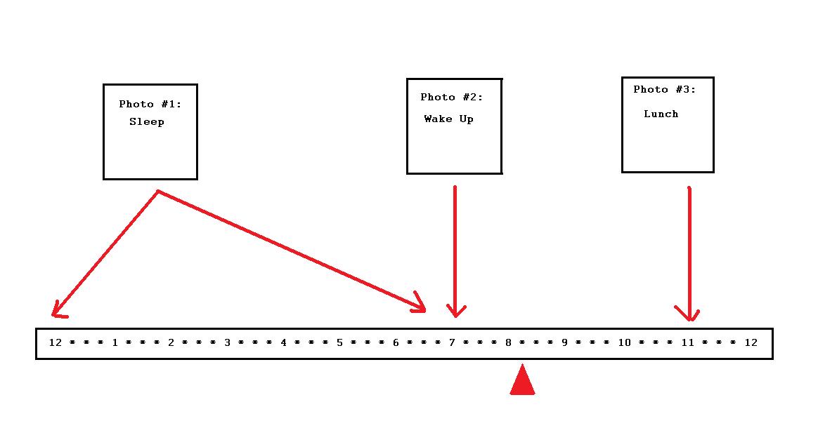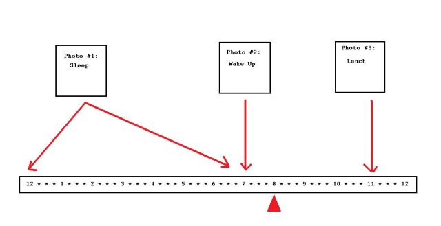 Then use a basic computer drawing program (such as Microsoft Paint) to draw a picture that includes photographs and a time bar, like so: