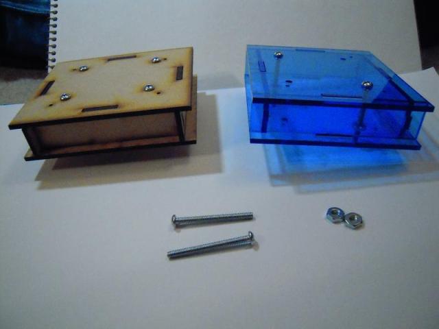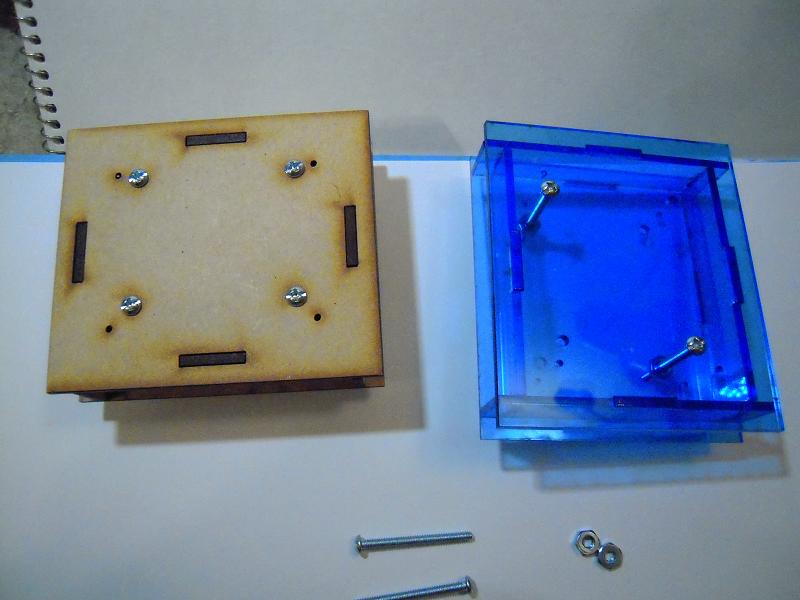 You’ll note that I’m only using two bolts on the acrylic, and while there are standoffs in the MDF box (trust me!), the bolts are all by themselves in the acrylic box. These modifications save on production costs and as it happens, the acrylic box appears to be quite tightly fit together without the extra securing hardware.