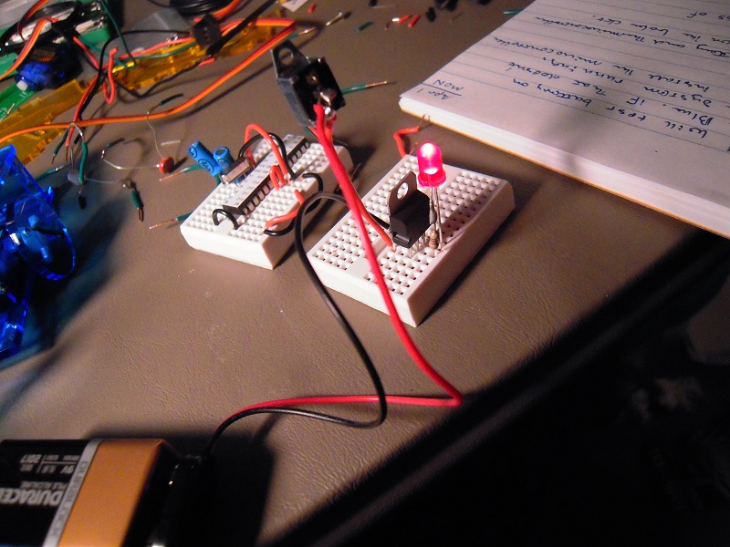 For the breadboard circuit on the right, as you can see, the LED does indeed light up. That tells us that the battery, switch, voltage regulator, and LED are all fine.