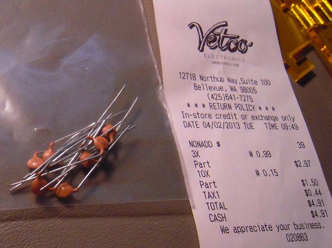 A quick trip to Vetco this morning, and I got some 22uF ceramic capacitors to replace the electrolytics that I was using in Metric Blue’s circuit. The LED blinked on cue. Success!