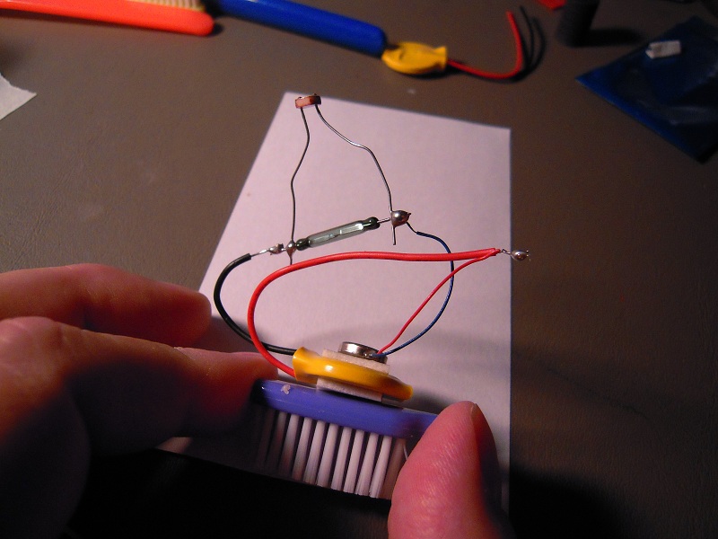 In my continuing efforts to find a simple product to market, I thought, “Why don’t I make some upgrade mods to the conventional brushbot?” So I ordered a brushbot kit from Maker Shed, and modified as shown. The long green component is a reed switch, which is activated by proximity to a magnet. There is also a photo cell in parallel, so that the brushbot can also be activated by a light source.