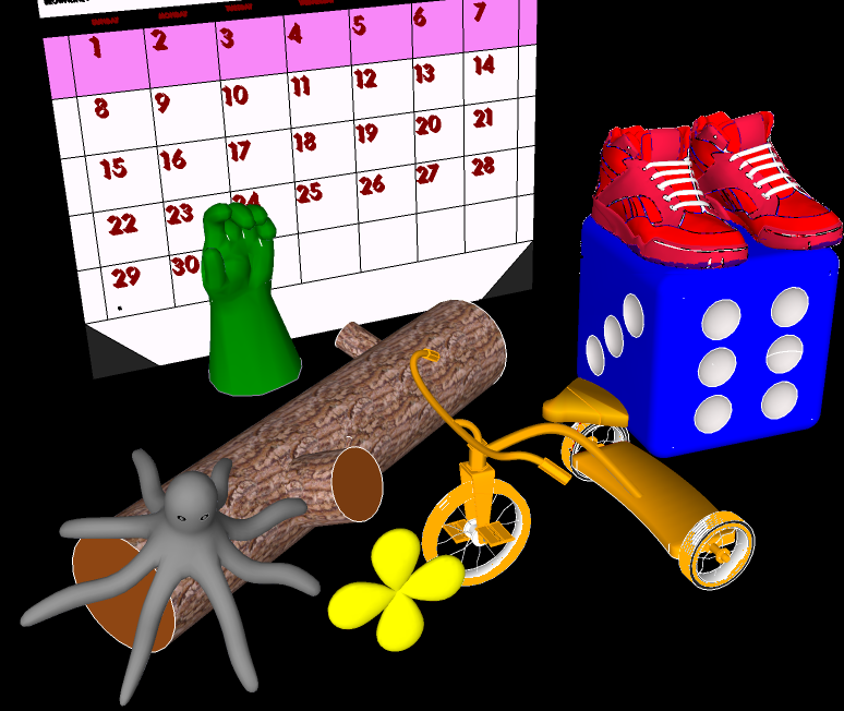 (Images downloaded from Sketchup Warehouse. CREDITS: Log by Ferrari, shoes by best-lemming, tricycle by Taylor, clover leaf by Super Builder, gloves by MorBius, die by syicreations, calendar by HARBURCOMPUTERS, octopus by [green])