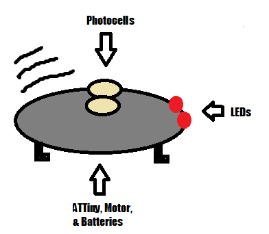 As you might guess from the dual photocells, grisbug would be programmable by holding it up to a computer screen and flashing commands. As to what to program, I was thinking that the user could program things like the light level at which the eyes blink on, then also the light level at which the motor runs. And maybe the motor could be programmed to beat out a tune, too!