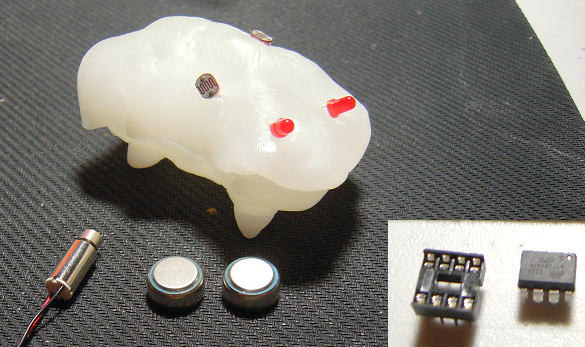 I’ve laid out all the components here to show that there’s more than enough room inside to accommodate them. Indeed, I might be able to squeeze in a mini breadboard. I also have a free pin on the ATTiny, so that I could add another LED for internal color.