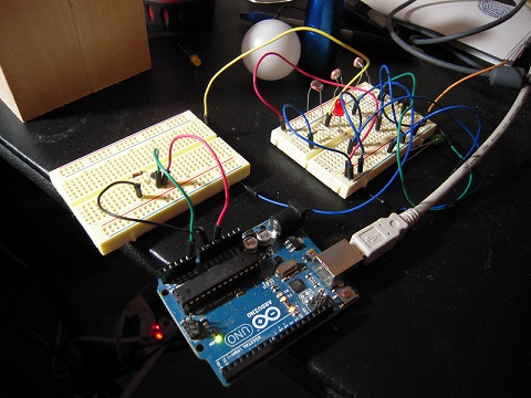 On the right, I was working with the good old photocell testbed, which I connected to Arduino analog input A0 and measured the light reflected off a ping pong ball. It turns out that an LED light source barely registers, even if the LED is labeled ‘ultra bright.’ However, next to the ping pong ball in the photo is a small blue LED flashlight, which illuminates the ping pong ball enough to register a very significant and measurable change in intensity at the A0 input.