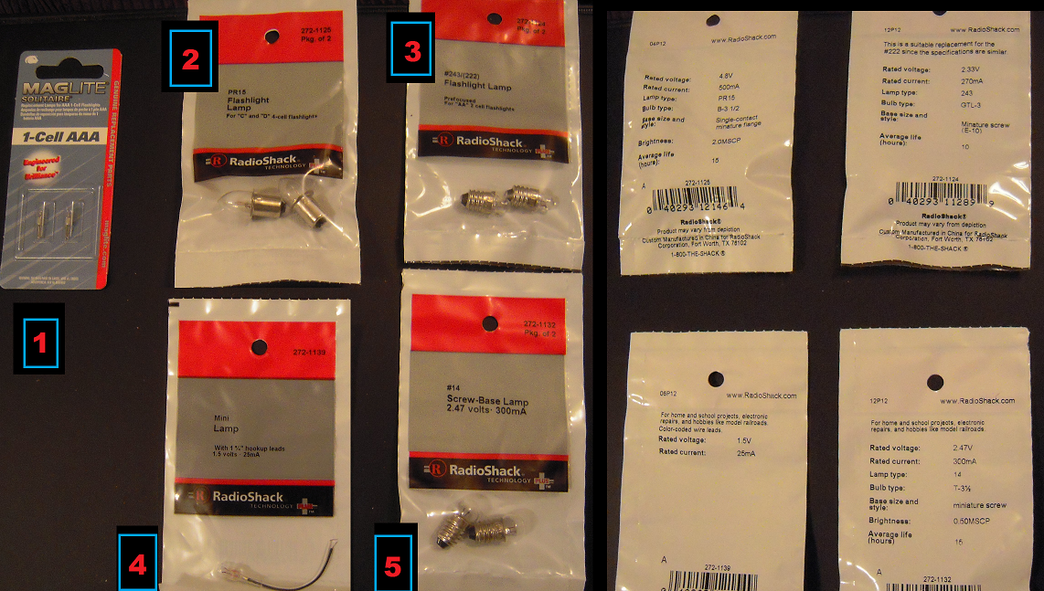 If Grisbot is to detect nearby objects by flashing a light on and off, it will need to carry its own lamp. So I went to Radio Shack and bought a few candidates. (NOTE: The packages shown on the right are simply the packages on the left after being flipped over in place.)