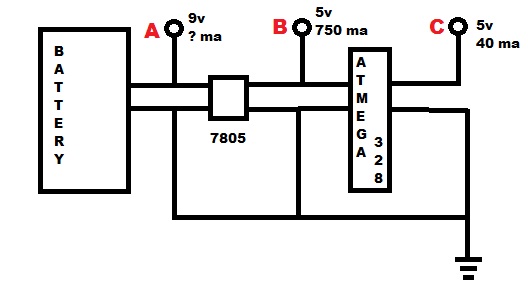 Point B is off the voltage regulator. The 7805 provides 5 volts and 750 milliamps according to an old reference book, which is what I put on the illustration but then I checked an online data sheet and it said 1.5 A. Progress!