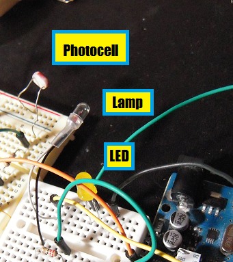 Again,the idea is to flash the lamp on and off. The photocell compares the on/off readings and if there’s a ‘significant’ (TBD) difference in brightness caused by the lamp light reflecting off an object, the LED will flash to indicate that an object has been detected.