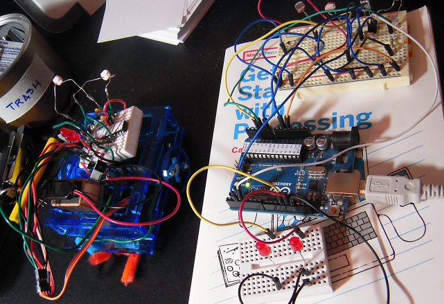On the right hand side of the photo is the ‘test bed’ that I use for robot programming. It consists of an Arduino and a couple of breadboards. The support platform is ‘Getting Started with Processing’ but any book of similar size and weight will do. : - )