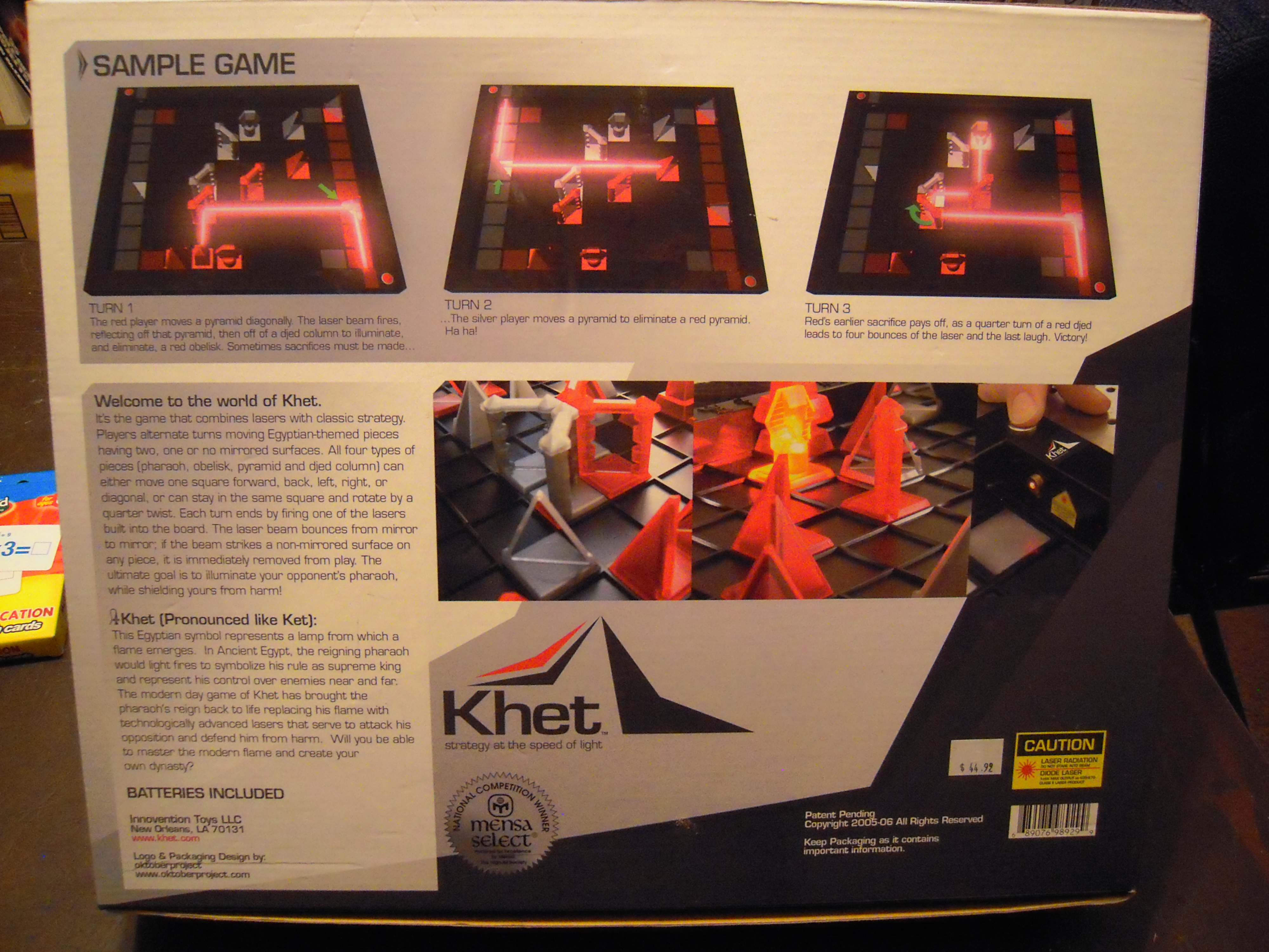 I want to hold onto Khet, but when I come to the meetings, I’ll bring it and let others play with it. Games like this are justified educationally because they teach critical thinking, strategic thinking, geometric analysis, and — IT’S GOT A LASER!!! (Enough said.)