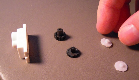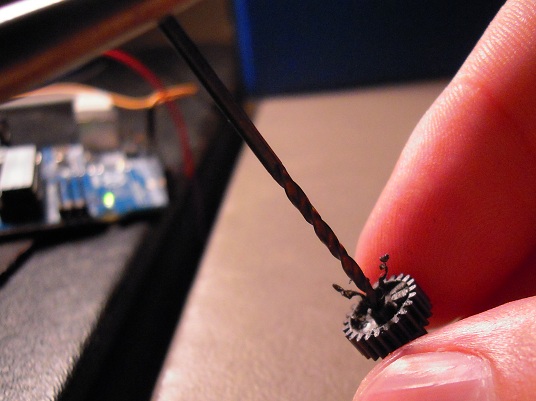 Again, take the big gear that goes on the potentiometer shaft. Stick the drill bit into the hole, and twist it through, widening the hole.