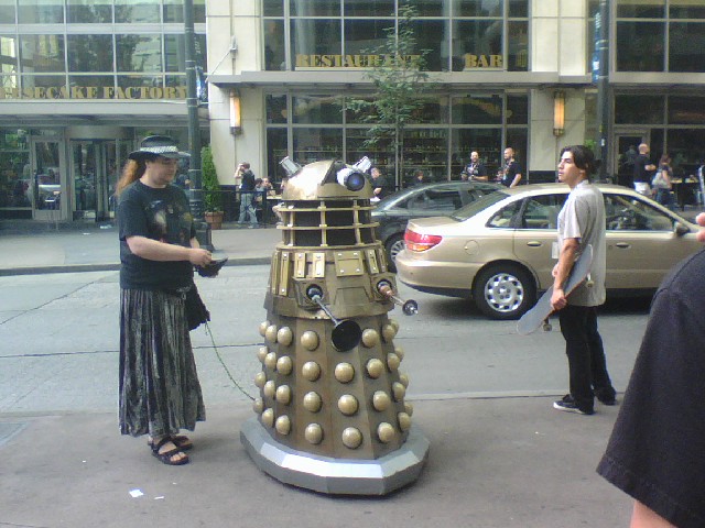 So all you get is this photo I took outside, of a Dalek walking its pet human.