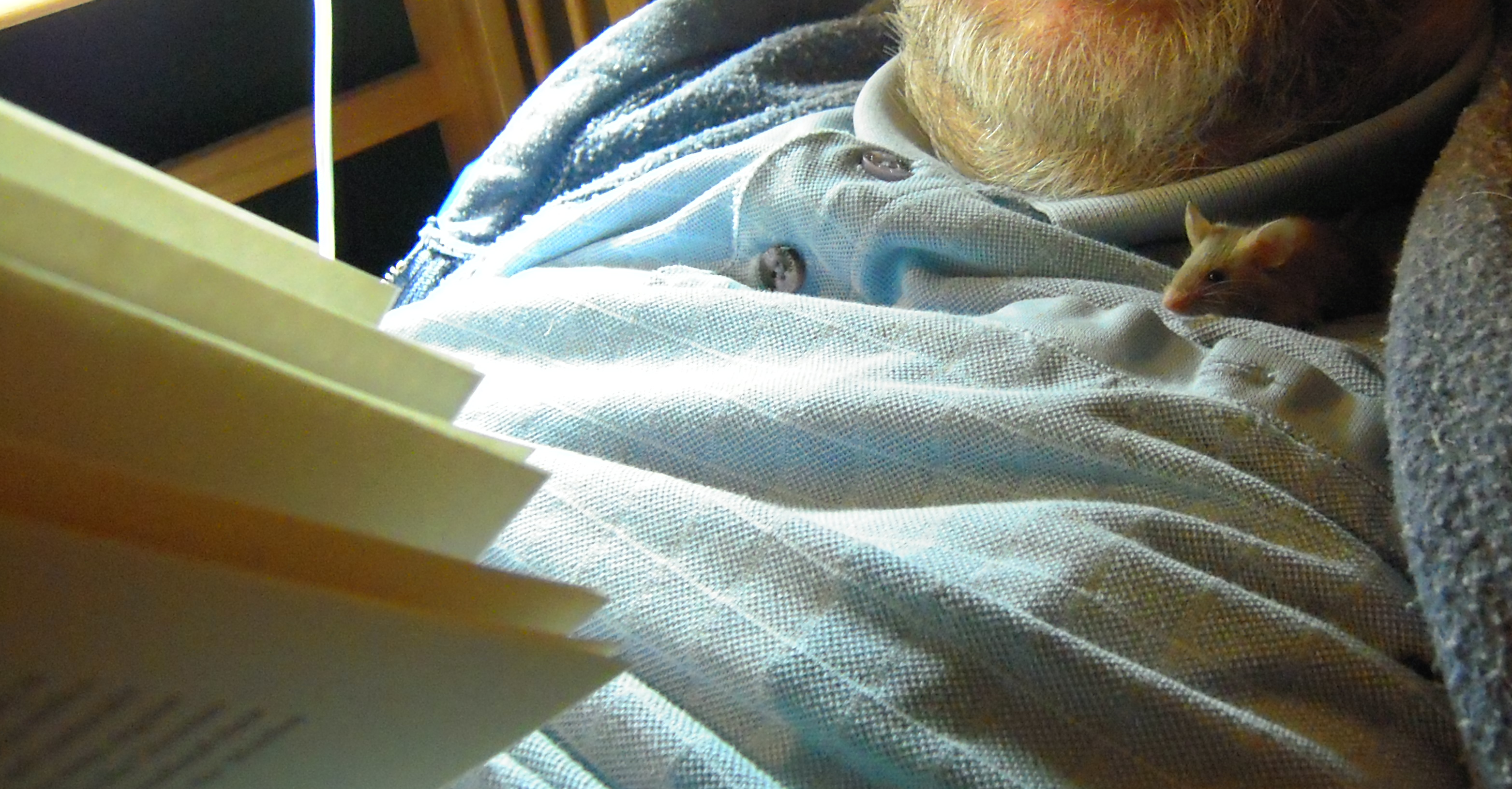 Easter is, above all else, a time of peace and joy toward rodents of all species and creeds. Hence I thought I’d show this photo of Stuart, my young apprentice mouse. Stuart may come to assist in the development of the Electronic Nonlethal Mouse Trap, though right now he’s leaning toward a career in foraging. If you’re interested, other photos of Stuart and mice I’ve had in the past are at Mousie Mousie. (Click to enlarge photo — Stuart is VERY photogenic.)