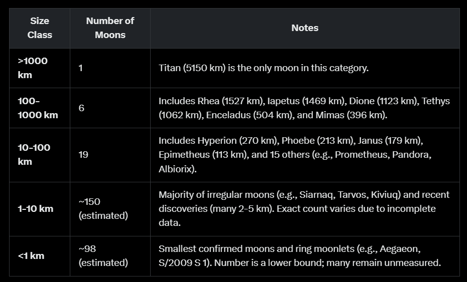 Astronomers recently announced that they have identified 274 moons around Saturn. I asked Grok for a numerical breakdown of size class vs. number of moons in that size class.